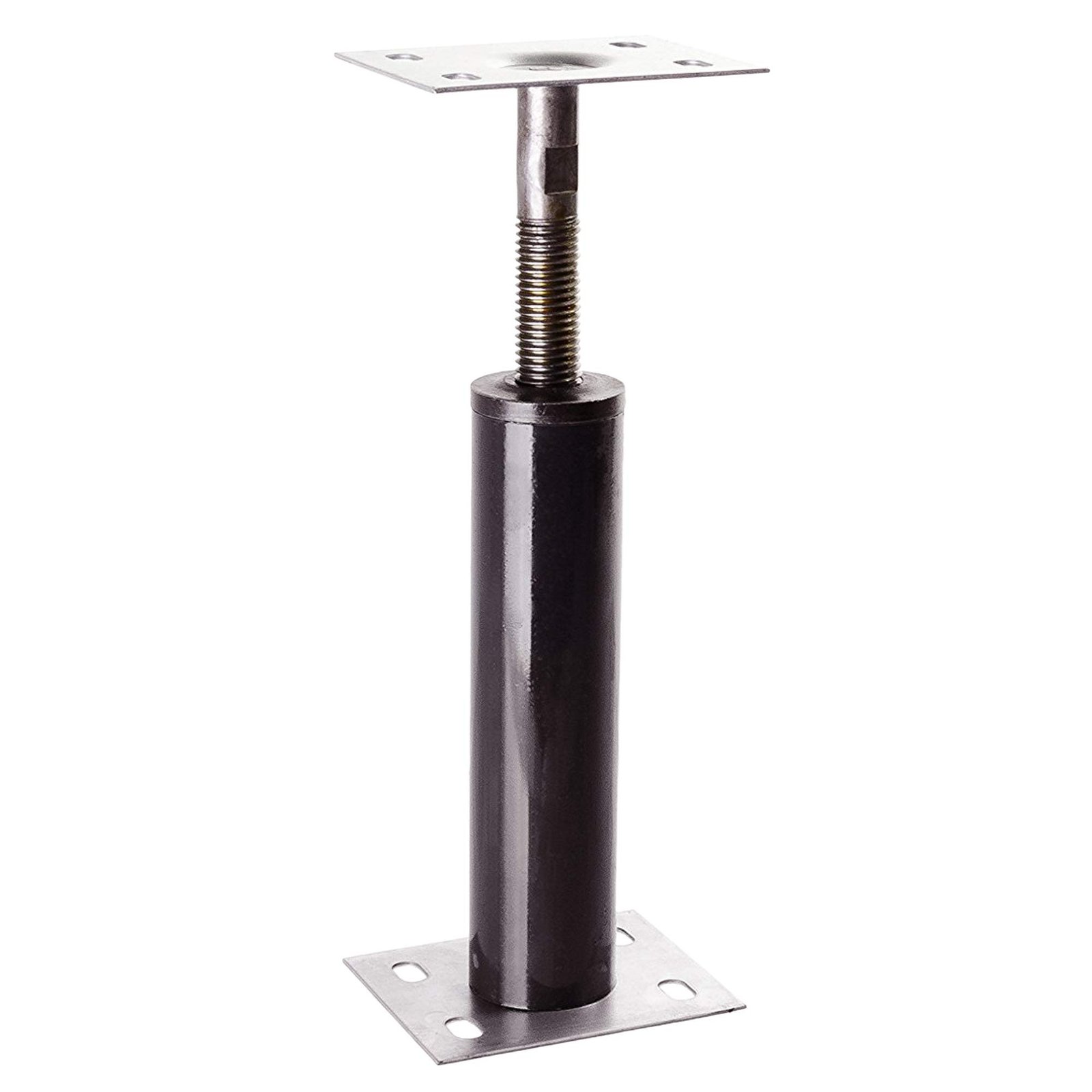 Adjustable, easy-to-assemble, easy-to-install floor jacks are designed for temporary support during remodeling projects to reinforce stairs, porches, decks, or weak floors. Made of premium quality steel to prevent corrosion with all moving parts snugly fitted to avoid displacement. The top and bottom plates are deeply embossed to mitigate movement. Double-locked heavy-duty high-carbon steel for added safety and compression strength. Ensure safe load limit by consulting a licensed engineer. Manufactured in the United States. Meets customer requirements.