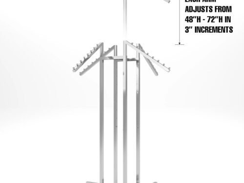 Econoco’s 4 arm clothing rack is the premier solution for clothing store displays. With 2 slanted and 2 straight arms, this rack offers versatile options for showcasing clothes. The adjustable arms can be set from 48” to 72” in 3” increments. The Black Matte finish gives a stylish look suitable for any store or boutique. Weighing 35 pounds, this rack is sturdy and reliable, ensuring your displayed clothing stays secure.