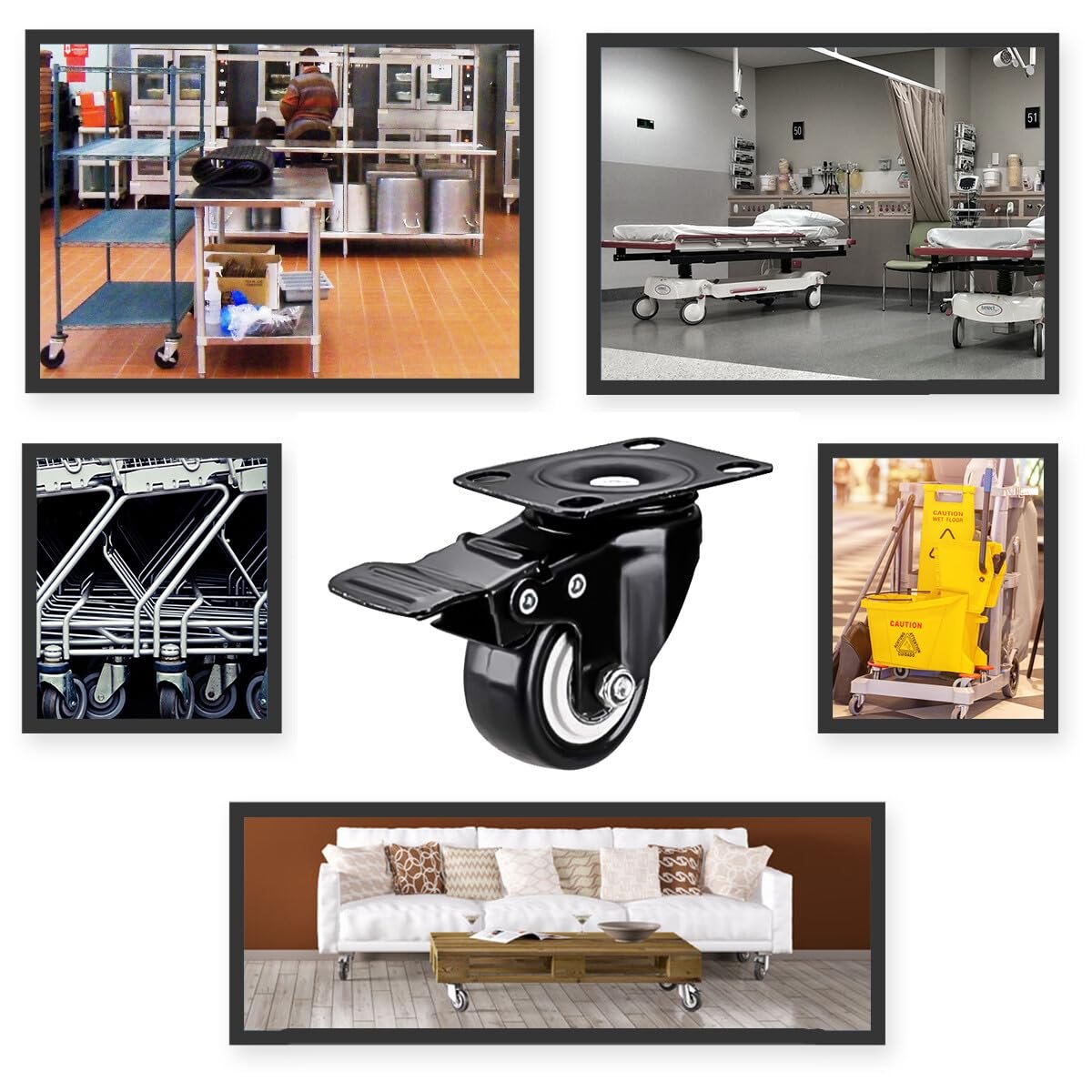 360-degree swivel casters for smooth turns. Suitable for various applications including furniture, bookshelves, workbenches, etc. NON-MARKING CASTER: Non-marking polyurethane rubber for quiet, shock-absorbing, and efficient movement. Strong loading capacity and safety.
