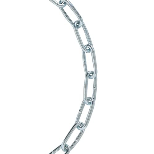 From the Manufacturer Coil Straight Chain has a longer link than machine chain, making it ideal for various applications such as guard chains, animal tie-chains, tailgate, and farm equipment. This zinc-plated chain measures 2/0 by 100 feet with a safe working load limit of 520 lbs. It is designed to ensure safety and reliability, so do not exceed the specified limit.