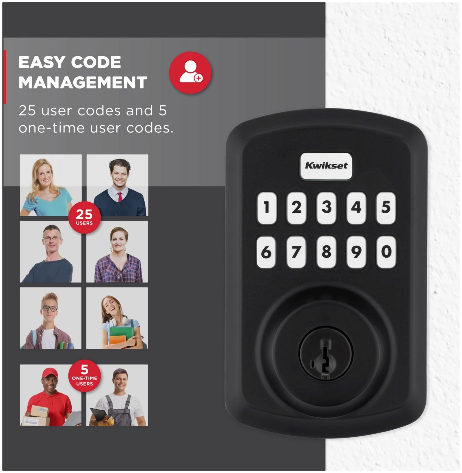 - Easy Code Management: Manage up to 25 user codes and 5 one-time user codes.