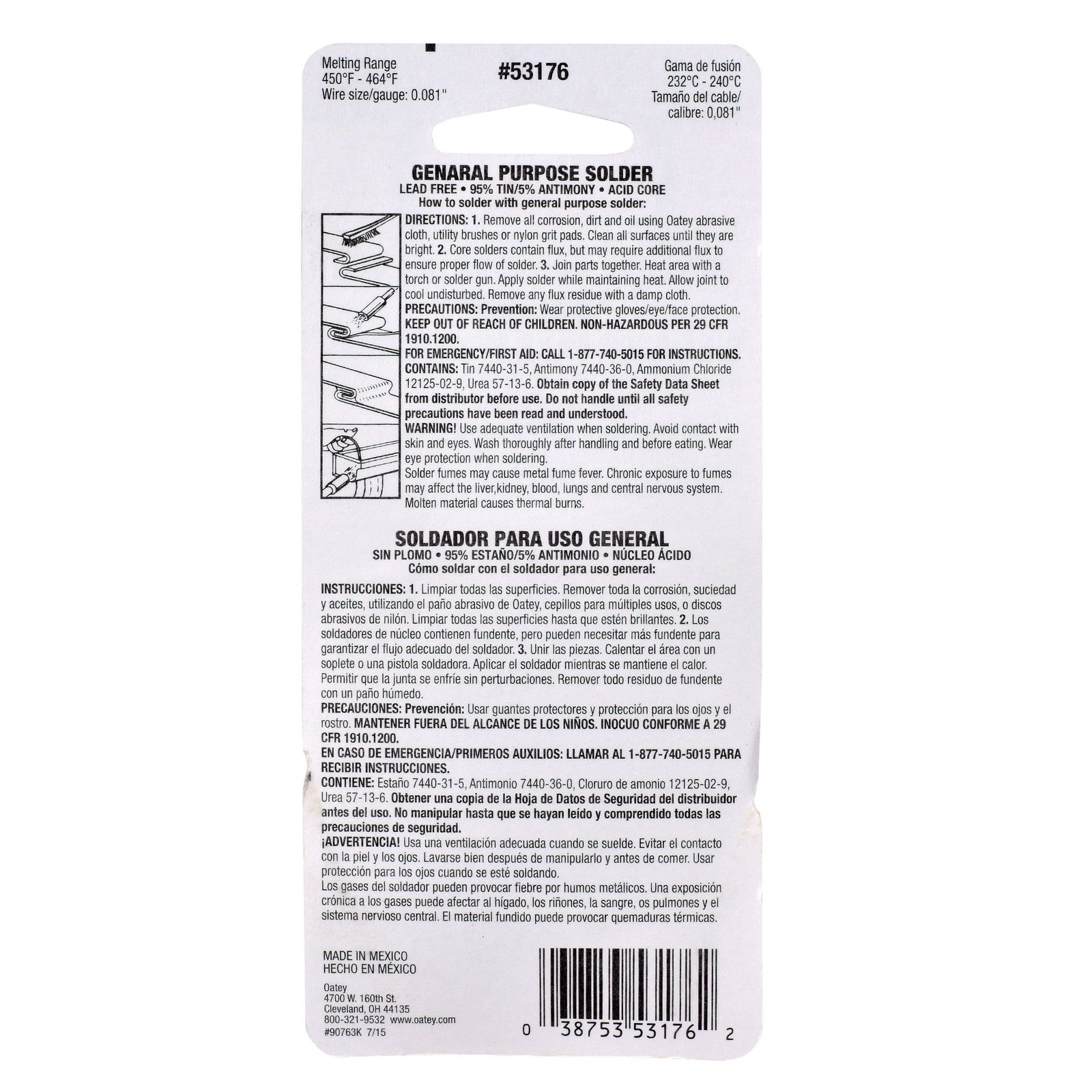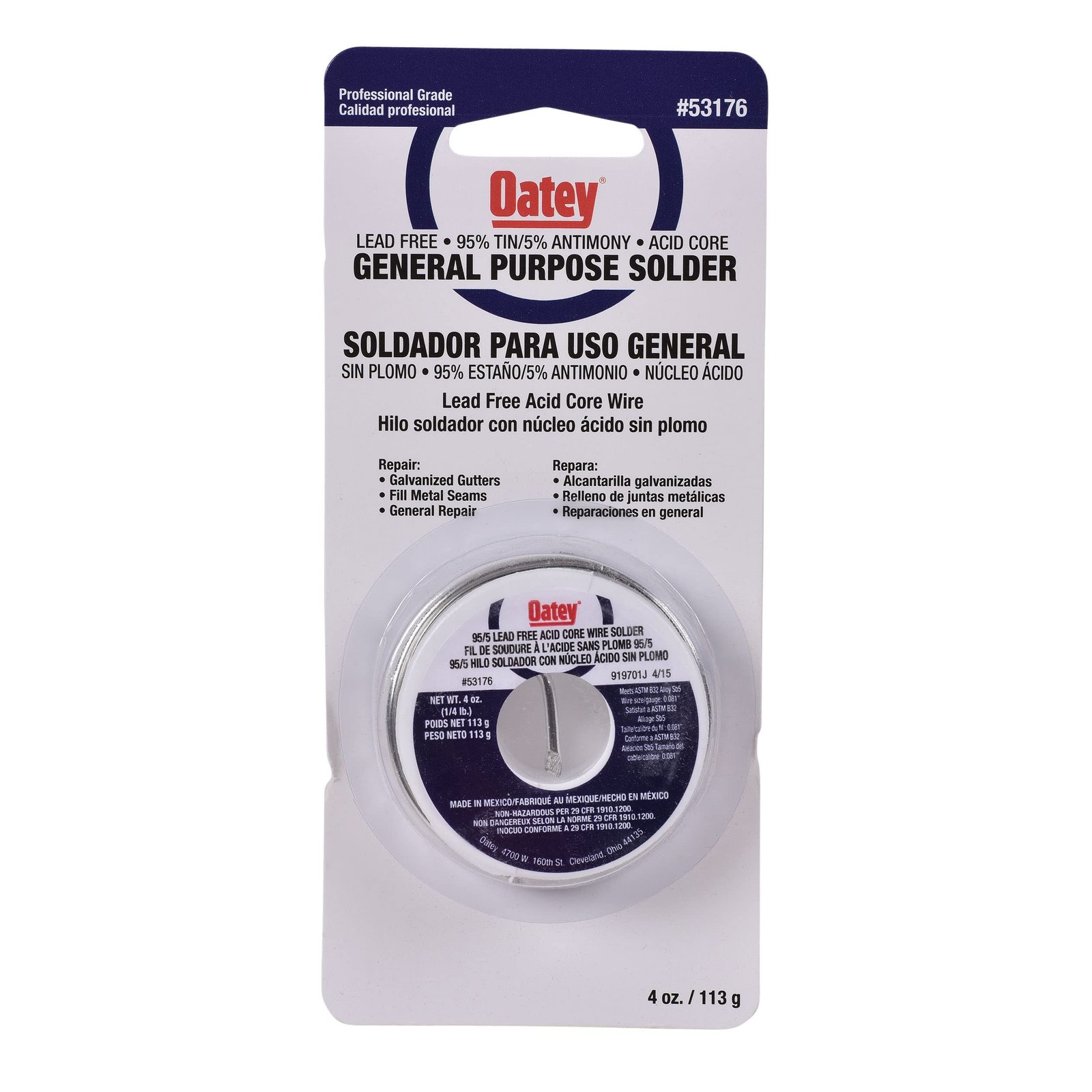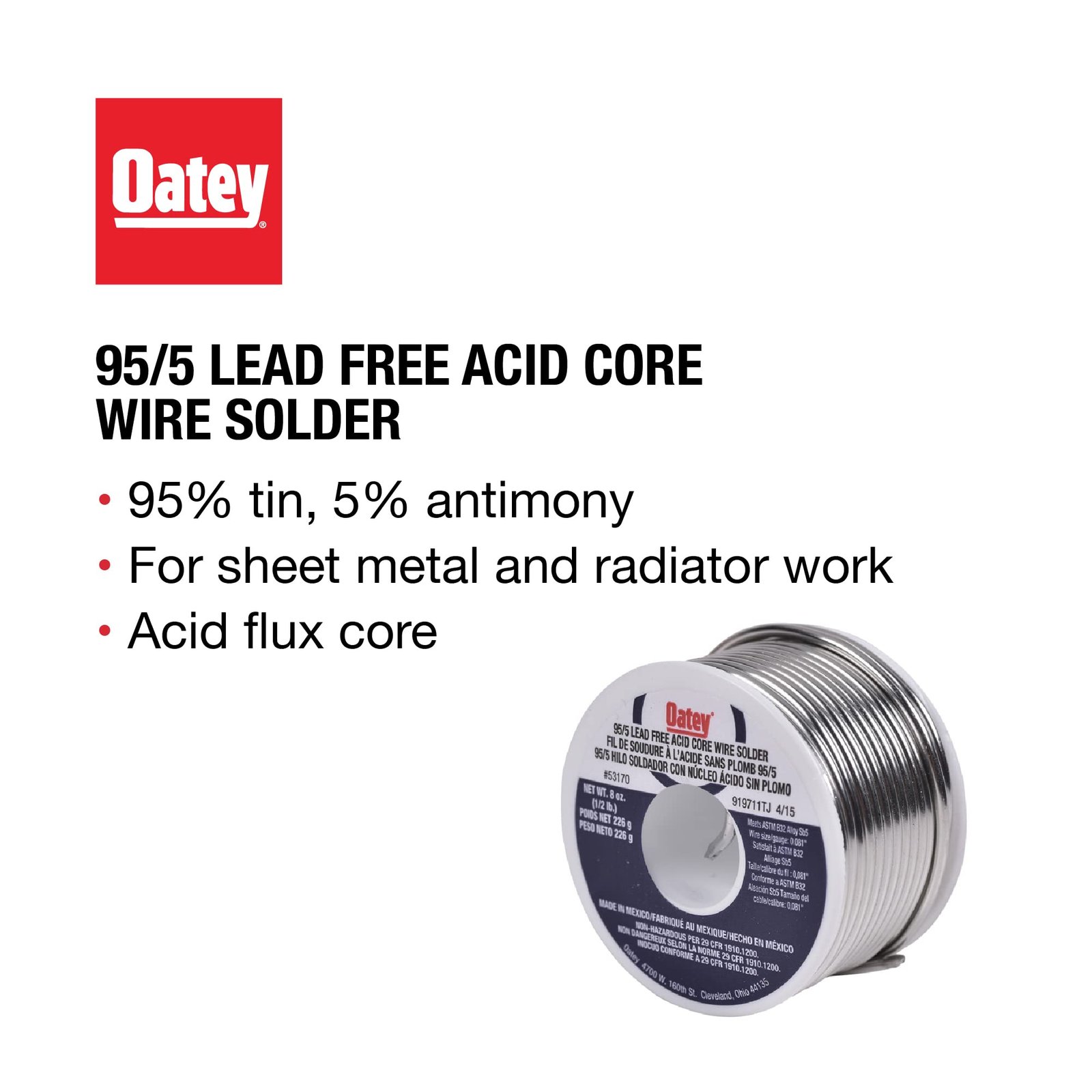 Oatey 95/5 Lead-Free Acid Core Wire Solder is a tin-antimony wire solder with an acid flux core. Ideal for repairing galvanized gutters, metal seams, and general repairs. Oatey products trusted by plumbing professionals for over a century.