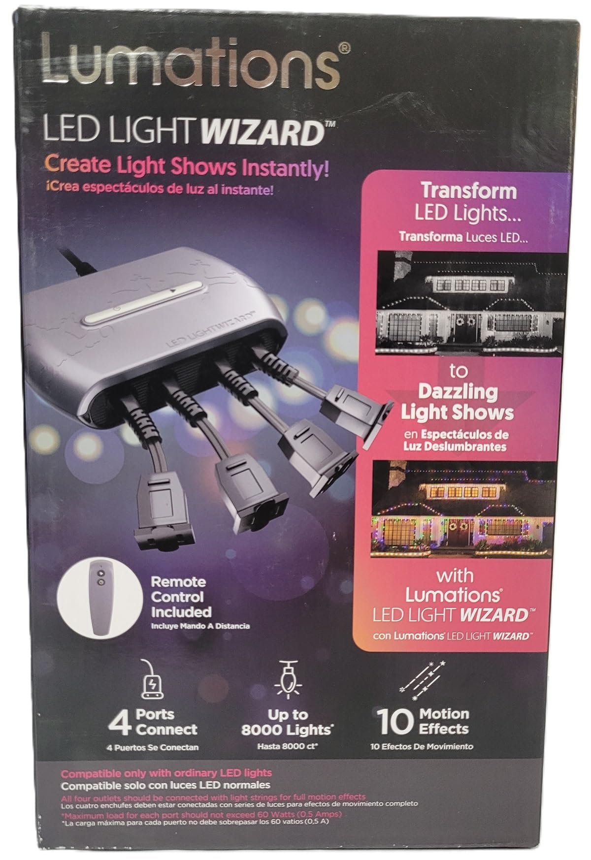 Upgrade your season’s celebrations with the Illuminations LightWizard. This device adds 10 motion effects to static LED lights with 4 plug-in outputs. Use the remote to control shows and timer effortlessly.