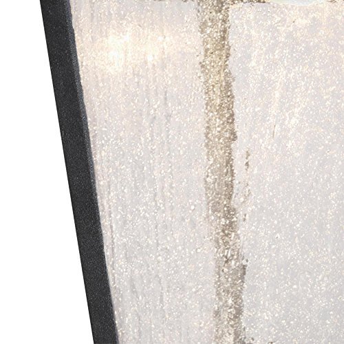 LED outdoor wall lantern with a black cast aluminum finish and seeded glass panels. 6″ width, 11″ height, extends 8″. 3000K color temperature, includes integrated LED bulb producing 300 lumens. Suitable for outdoor use.