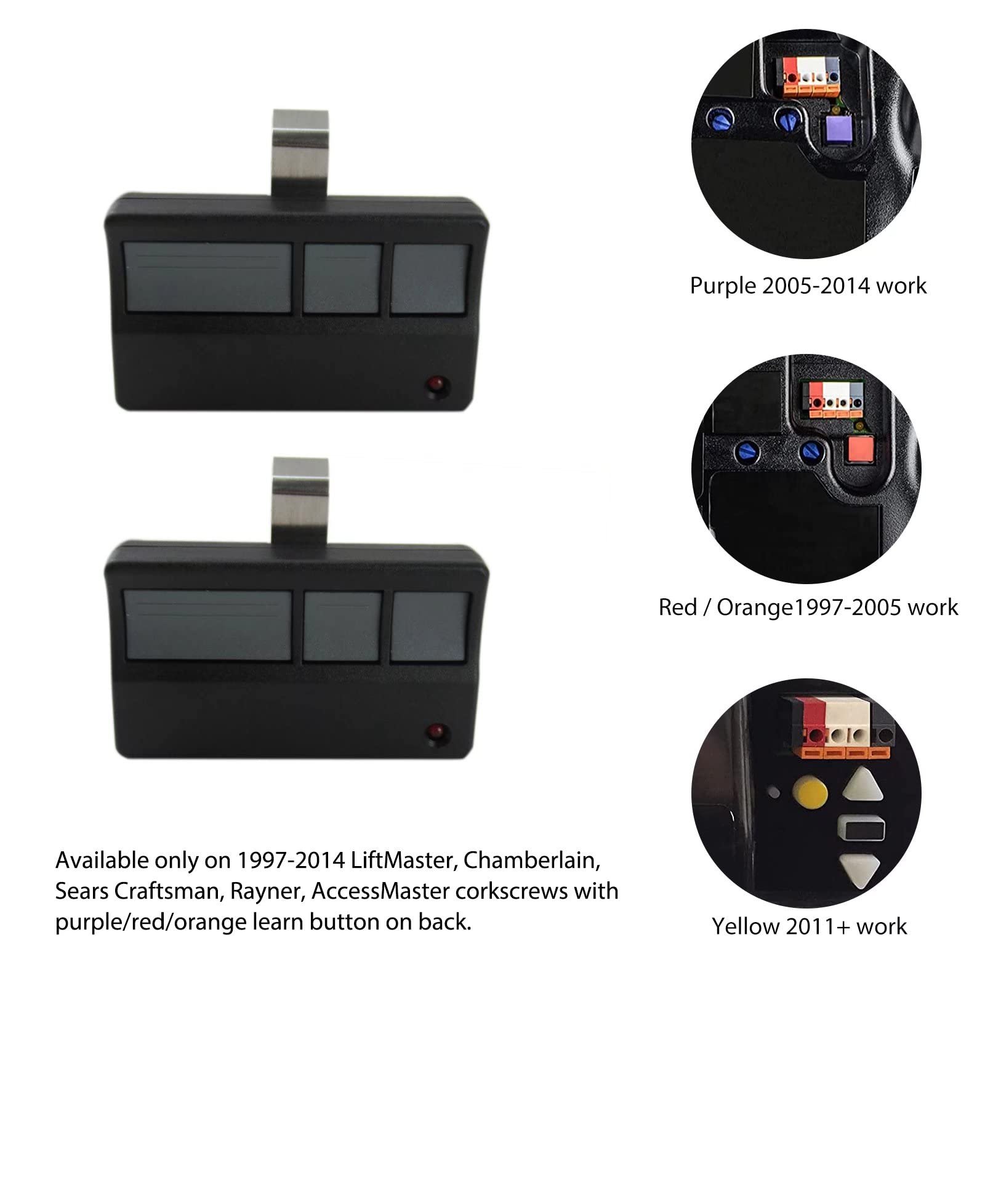 1. Security+ 315 MHz (Purple learn button openers 2005-2014) remotes model below: