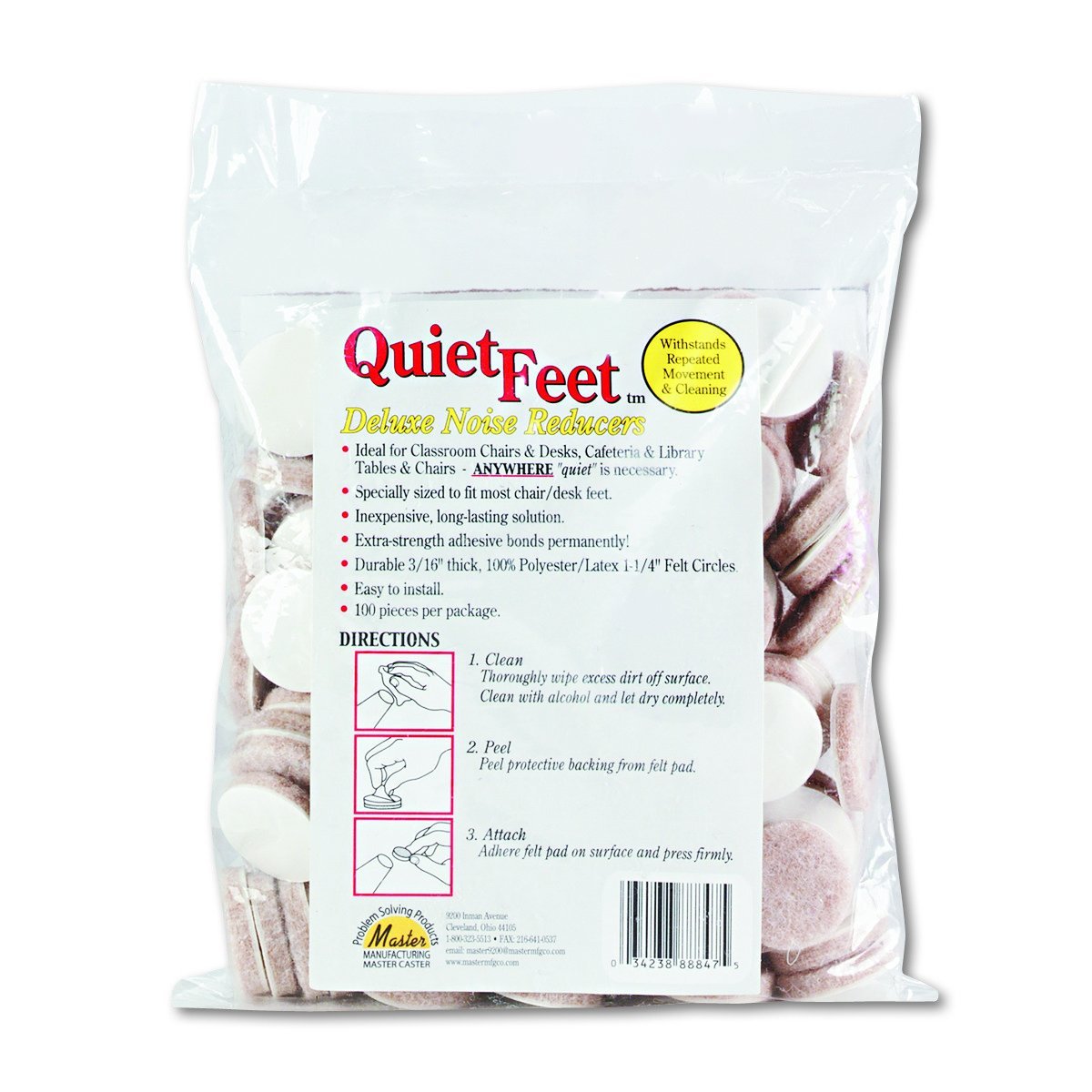 Master offers Quiet Feet Deluxe Noise Reducers to protect your flooring surfaces from scratches and marring. These noise reducers provide a buffer against noise and vibration caused by moving furniture, ensuring quiet surroundings wherever needed. Made of durable 3/16 inch polyester/latex felt, they adhere securely to various surfaces for long-lasting use. Easy to install and suitable for chairs and desks, these noise reducers help maintain a peaceful environment in homes, offices, schools, or libraries. Master products provide simple DIY solutions for organization and repair needs.