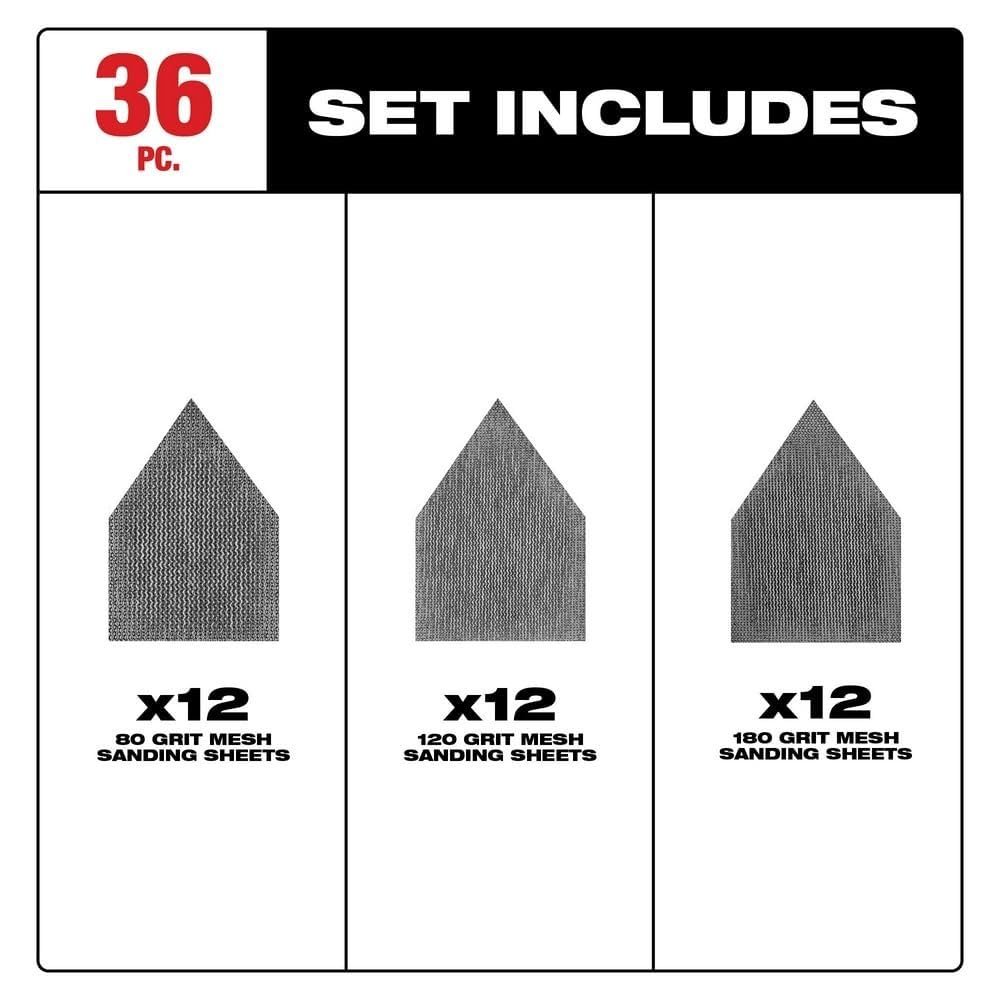 The Milwaukee Mesh Sanding Sheets for M12 FUEL Orbital Detail Sander are designed with Milwaukee POWERGRID Tear Resistant Mesh for maximum durability, delivering up to 12X longer life compared to standard sandpaper. These Mesh Sanding Sheets use an open weave design to minimize clogging and reduce material build-up for a smooth and flawless finish. The durable nylon backing increases protection against sharp edges, tight corners, and tough material removal applications while utilizing sharp aluminum oxide grain for faster finishing. The reusable mesh sanding sheets are easy to clean for longer life, simply shake, vacuum, blow, or rinse to clear away debris. The high-quality hook and loop provide a secure connection and fast grit swaps. Sanding sheets are available in 80-grit to 400-grit for use in wood, metal, and plastics. Includes free pad saver for reduced wear on sander pad. Ideal for woodworking, metalworking, and plastic shaping.