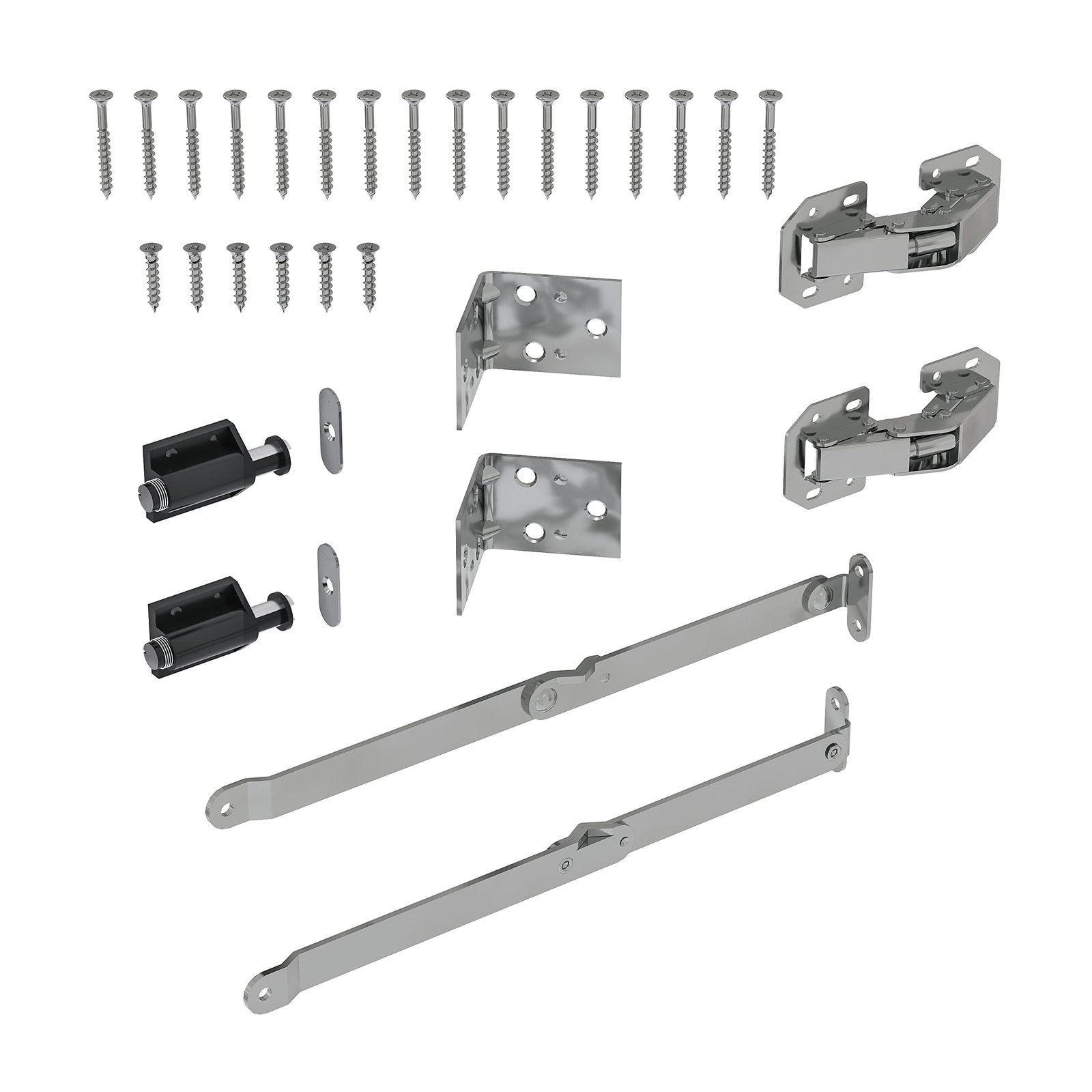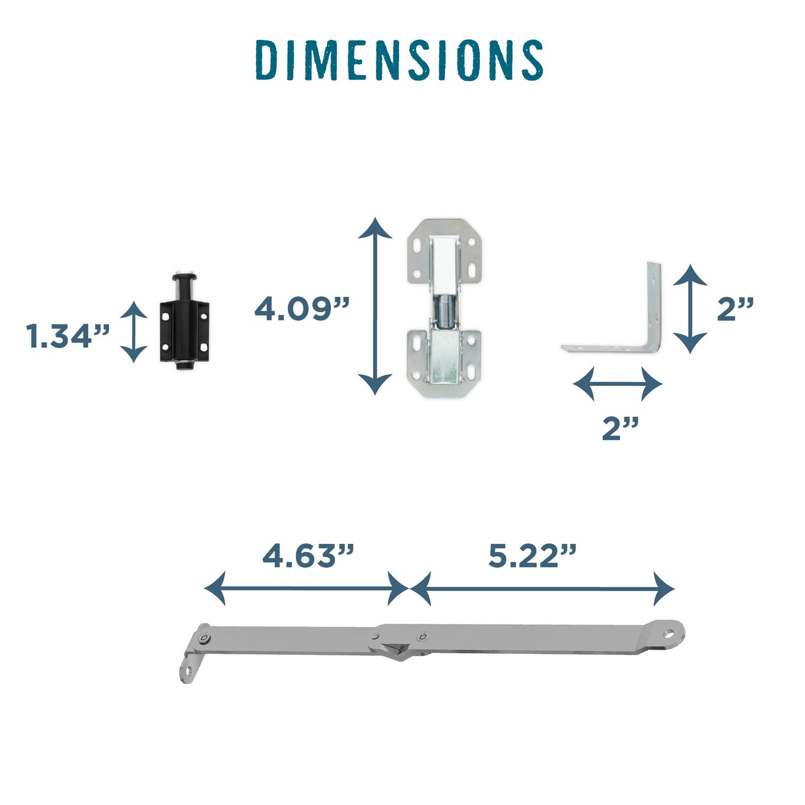 Assorted finishes. What is included in the kit? The kit includes 16 Wood Screws, 2 Magnetic Catches, 2 Folding Support Arms, 2 Hinges, 2 Mounting Brackets, and 6 Mounting Bracket Screws. Note: wood is not included in the kit. What material is the kit made of? It is made of steel and plastic. What mounting hardware is needed for installation? All mounting hardware included for installation into studs. What’s the safe working load? The kit has a safe working load of 50 lbs.