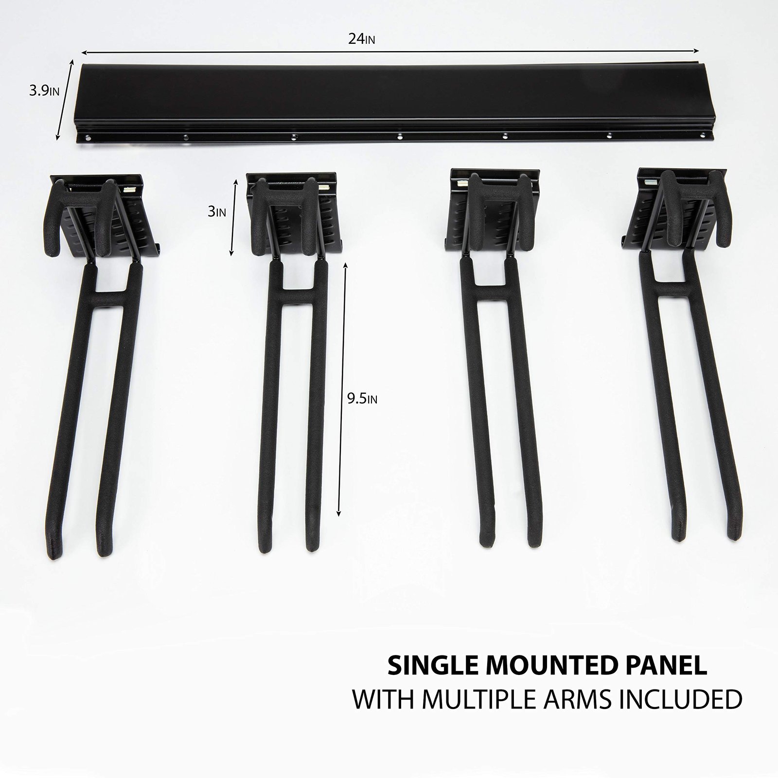 Convenient wall-mounted design, powder-coated steel construction, adjustable rubber-coated hooks for secure and scratch-free storage.