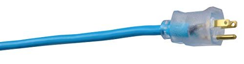Southwire outdoor extension cord SJTW rated Hi gloss fluorescent blue. This contractor grade cord features a neon jacket that adds to safety on the jobsite. Includes power indicator light and heavy-duty strain relief. From the Manufacturer: Weather resistant with reinforced blade and ground pin.