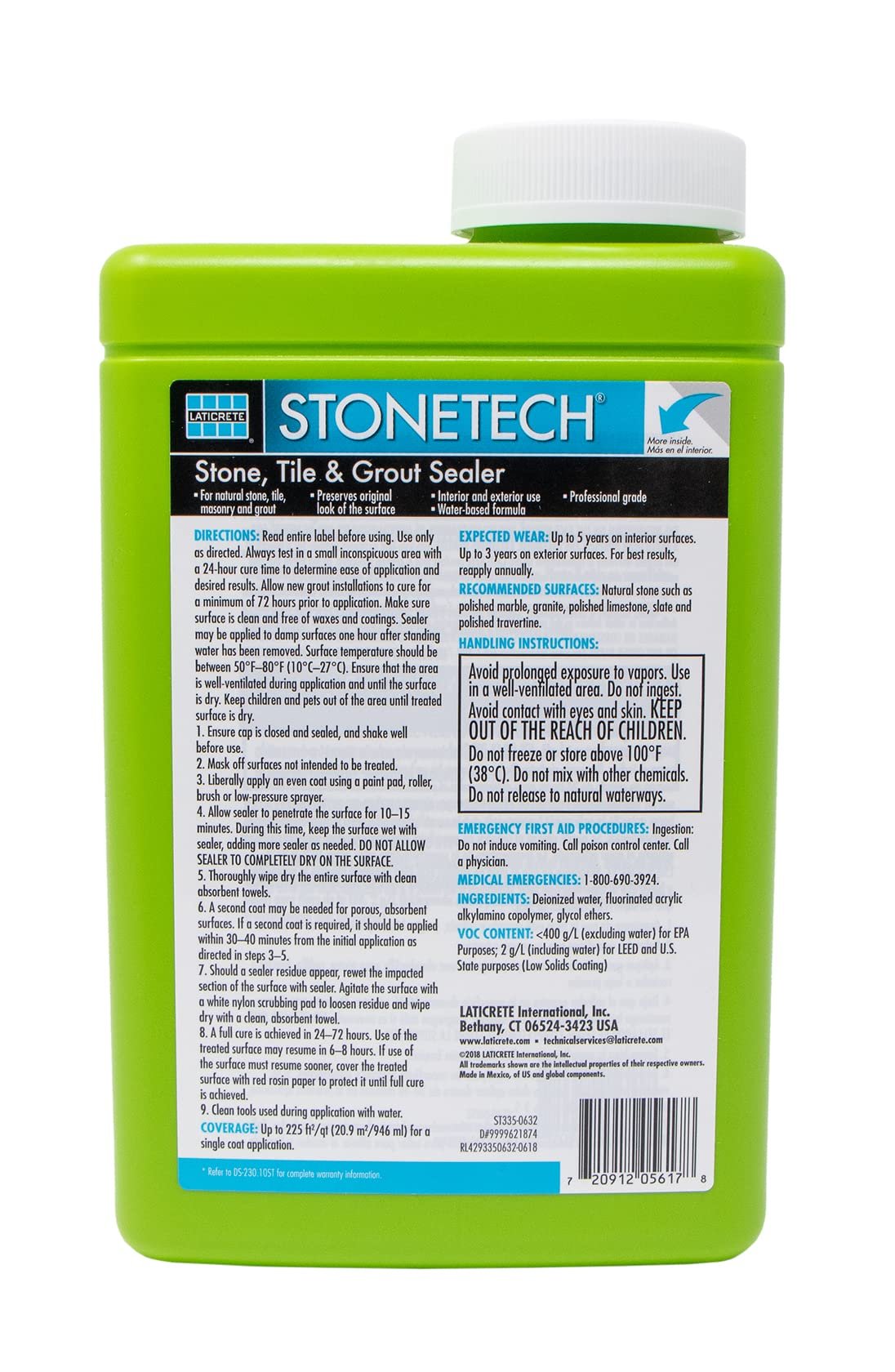 STONETECH Stone, Tile & Grout Sealer is a water-based, penetrating sealer that protects against stains on natural stone, tile, masonry, and grout in interior and exterior applications. Safer than solvent-based formulas, it offers 10-year product guarantee.