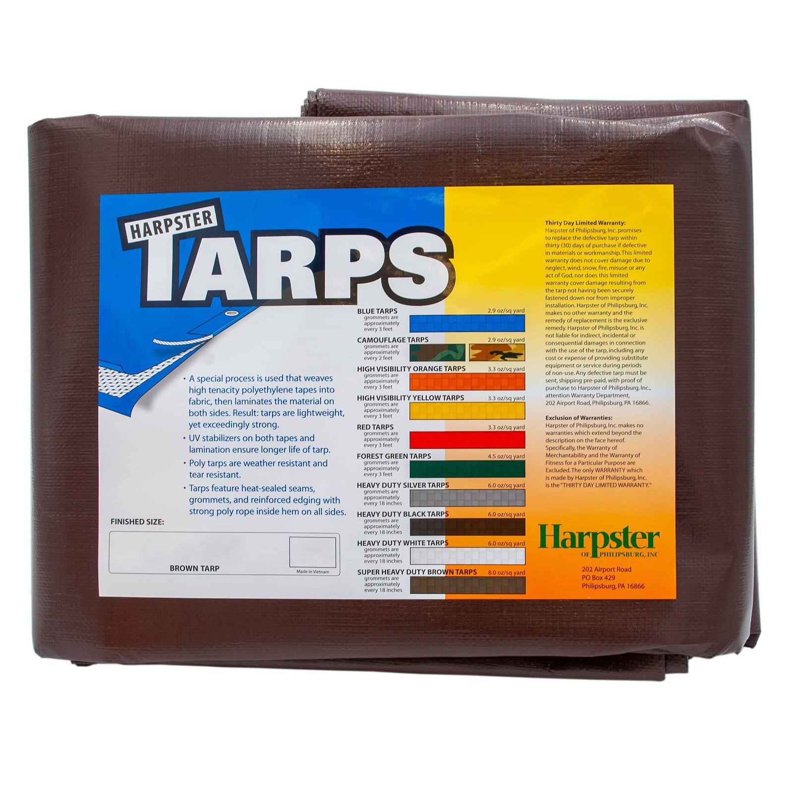 Super Heavy Duty Brown Tarp – Waterproof, Tear Resistant, Acid Resistant. 8 oz per square yard, 16 mil thick with a 16×16 weave count. Grommets every 18 inches, reinforced corner grommet, finished size approximately 2% or 6″ shorter.