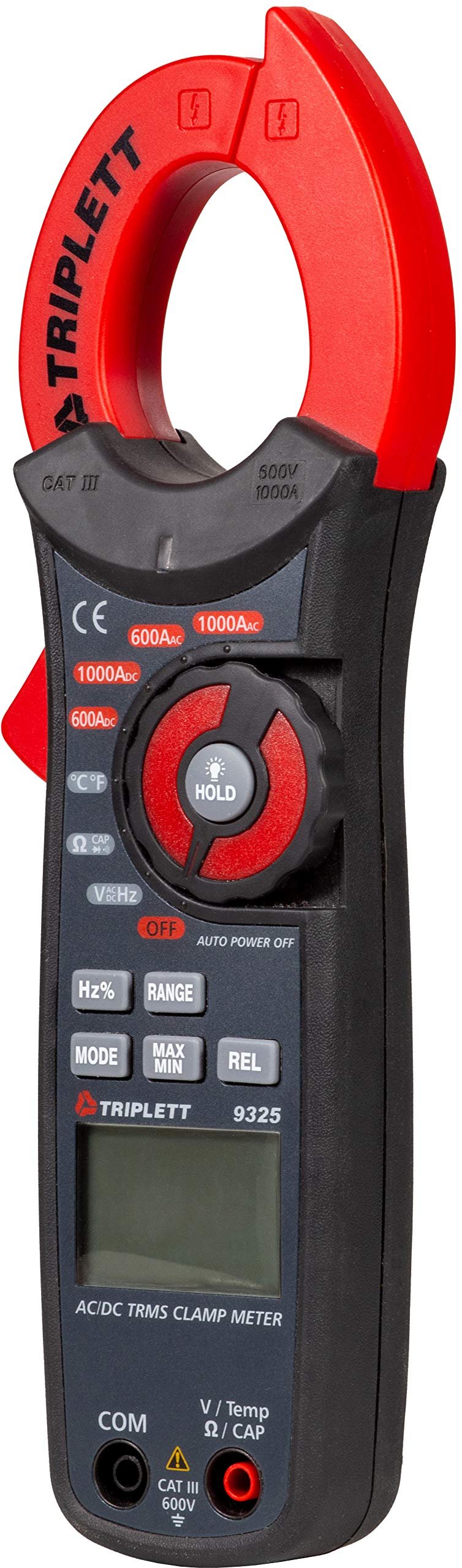 The Triplett 9325 True RMS Multimeter is designed for rugged use with features like rubberized over-molded housing for impact resistance and auto power-off to save battery life. The large backlit display ensures readability in all conditions, while the CAT III 600V design provides over-voltage protection in demanding industrial environments. It comes complete with essential accessories like test leads, Type K Temperature probe, 9V battery, and a carrying case to meet the needs of contractors and professionals.